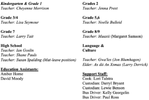 Administrative Assistant: Sym Gyemk Gibau Hana’ax (Sondra Henry) E: s.henry@nagkschool.ca
